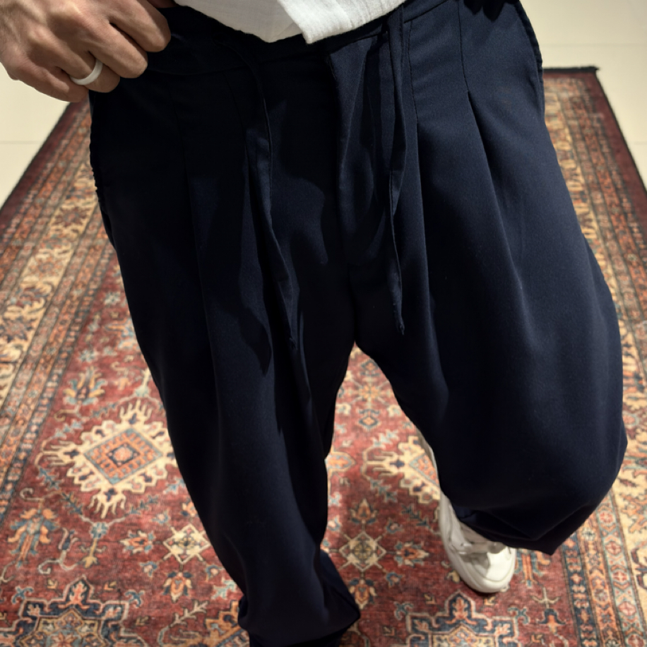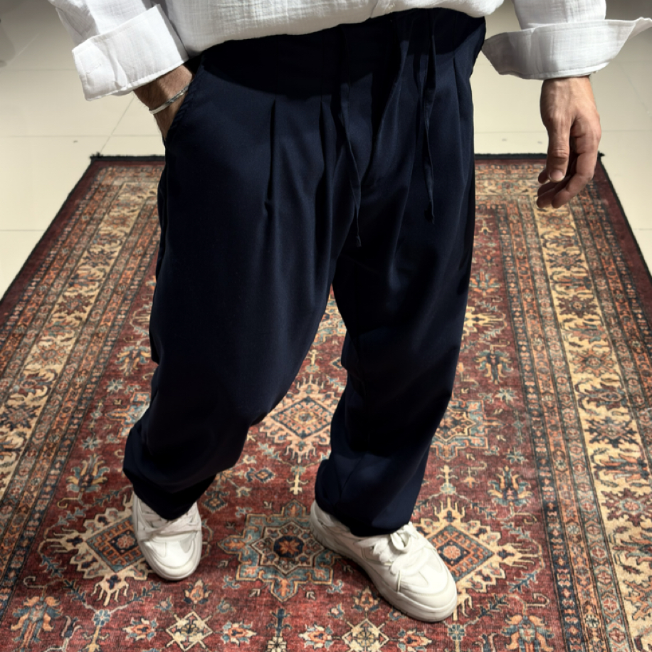 Modern, konforlu ve şık bir görünüm için Baggy Kumaş Pileli Pantolon – Lacivert tam sana göre!